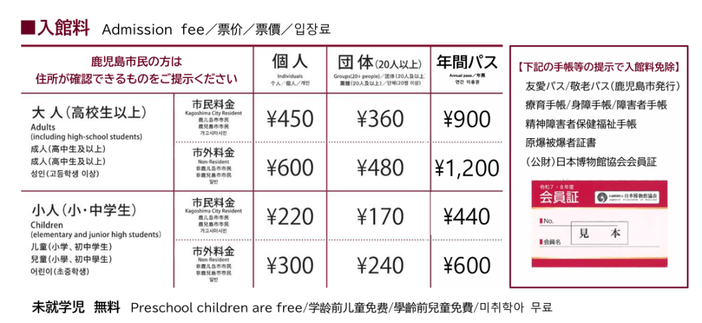 鹿児島市の施設使用料改定に伴い、令和7年10月1日より当館の入館料(個人、団体、年間入館券)が下記のとおり改定されます。